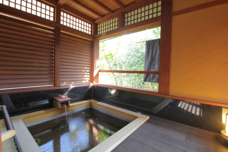 自慢のお風呂は全国でも第2位の硫黄含有量を誇るエメラルドグリーンの温泉で、美肌効果も期待。大浴場のほか「一の湯」「外の湯」のふたつの源泉貸切露天風呂があり、プライベートな空間で月岡の湯を堪能できます。