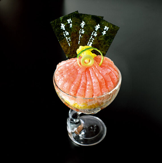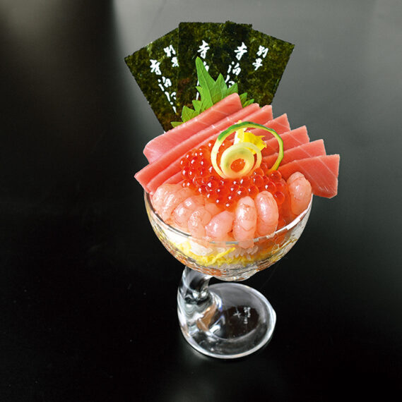 キラキラと輝く新鮮な魚介をグラスに盛り込んだ、別亭 寺泊にほん海の『海鮮丼パフェ』。