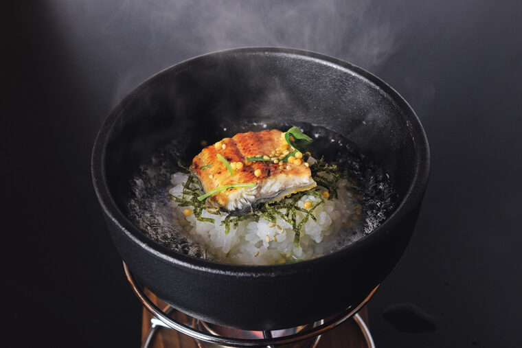 〆は、鉄鍋で炊き出したアツアツのダシ茶漬けを。海鮮丼の具材をのせて食べるのもおすすめです。