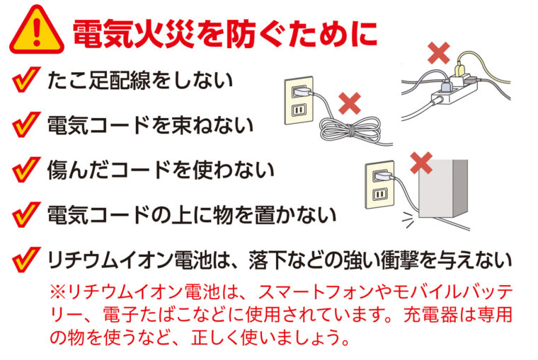 「火災」といえば、タバコやコンロなどのイメージがありますが、普段使っている電気機器などが原因の「電気火災」が多く発生しています。
