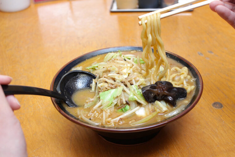 麺は燕市吉田にある近藤製麺所による太ちぢれ麺で、噛むほどにうまみが広がります。ひき肉とラードで炒めた玉ネギ、キャベツ、モヤシの野菜炒めがたっぷりのり、ボリュームも満点。
