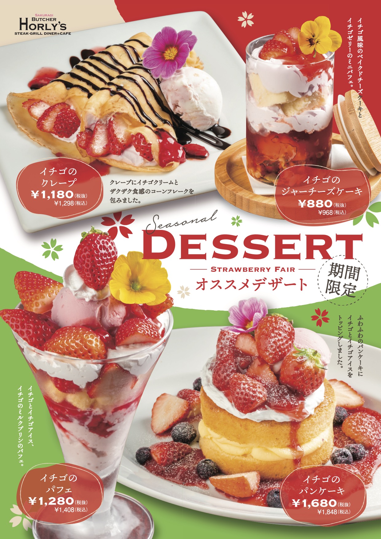 イチゴとイチゴアイス、イチゴのミルクプリンと合わせた『イチゴのパフェ』(1,408円)など、今だけの甘い誘惑が満載です。