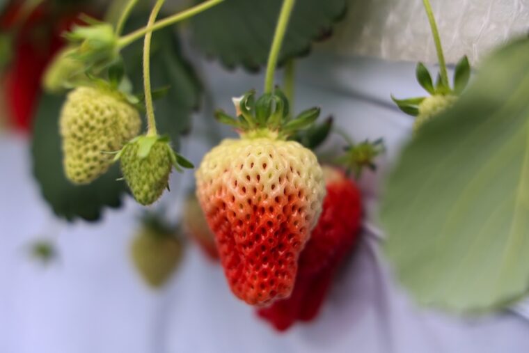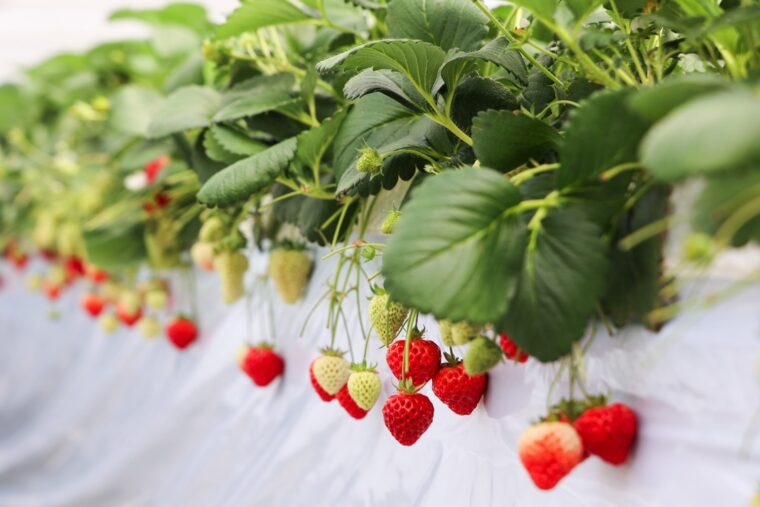 また、ハウスでは高設栽培を取り入れています。地面から1メートルほどの高さにある実を収穫するため、腰を曲げることなく、楽な姿勢で収穫作業を行なうことができます。