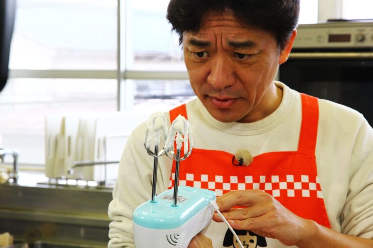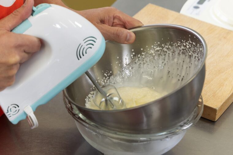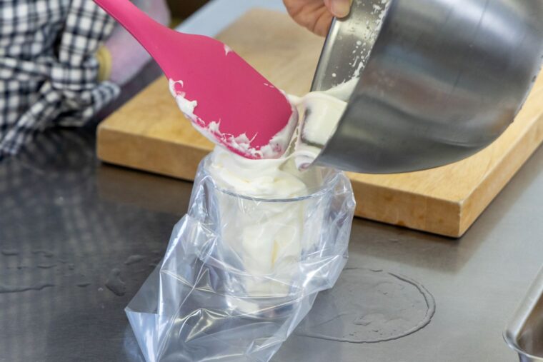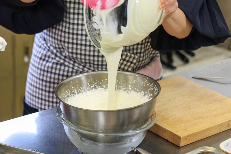 (4).生クリームを氷水で冷やしながらツノが立つまで泡立てる。粗熱がとれた(3)を流し入れてよく混ぜる。