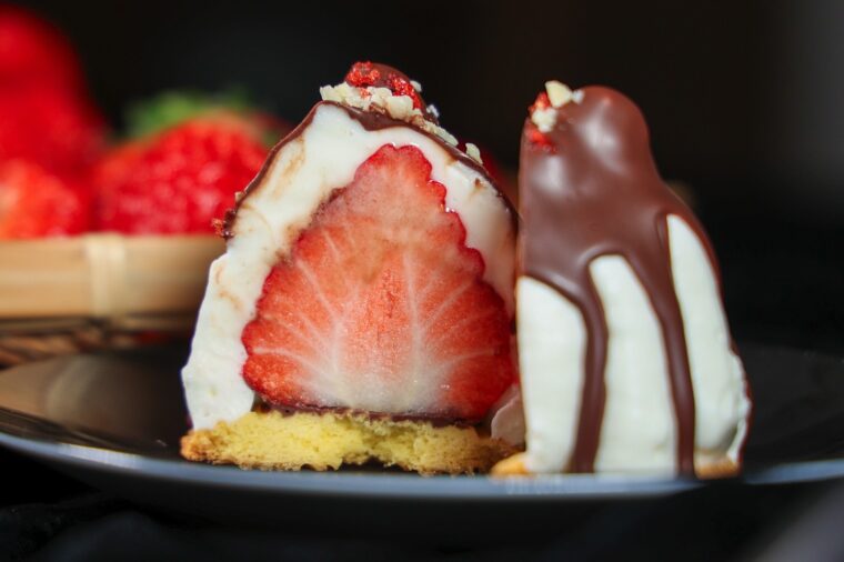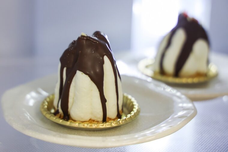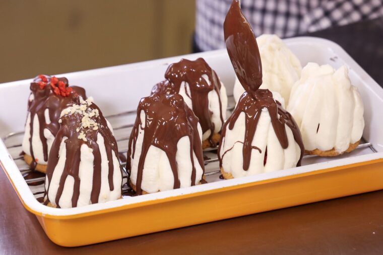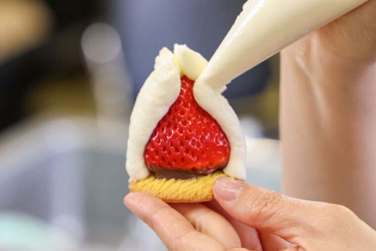 (5).絞り袋に(4)を入れて(2)に絞る。越後姫が隠れるようにまわりをクリームで覆ったら冷蔵庫で少し冷やす。湯煎したチョコレートをかけて、冷蔵庫に入れて冷やしたら完成。トッピングはお好みで。