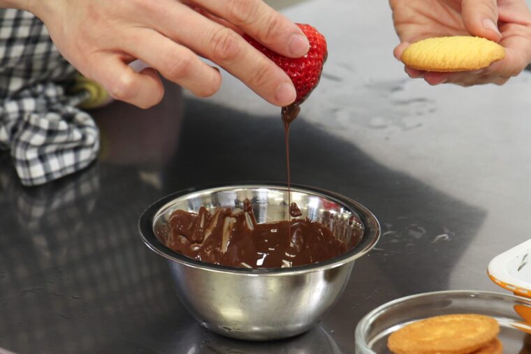(2).チョコレートを刻んで、湯煎にかけて溶かす。越後姫のヘタをとった部分にチョコレートを少しつけて、クッキーに上にのせる。