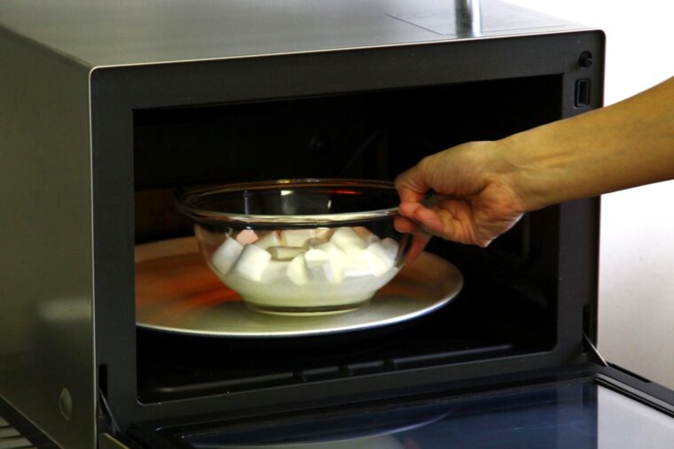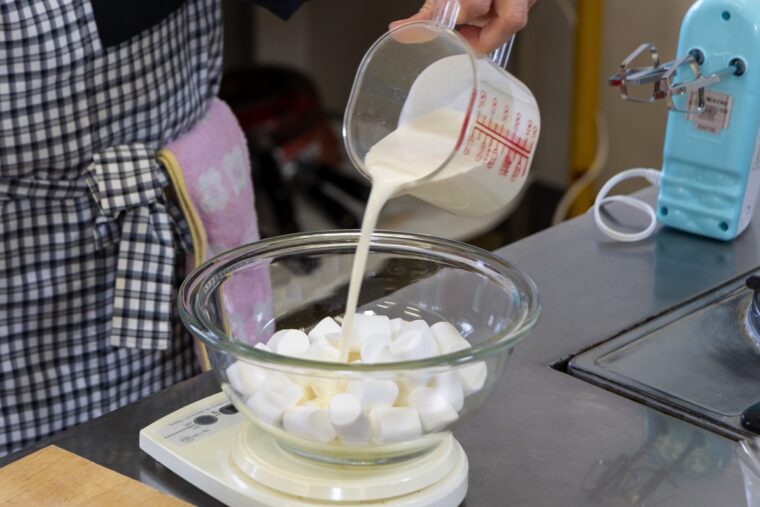 (3).耐熱のボウルにマシュマロ、生クリーム(大さじ2)を加えてレンジで40秒加熱する。膨れたマシュマロを潰しながらホイッパーで混ぜる。