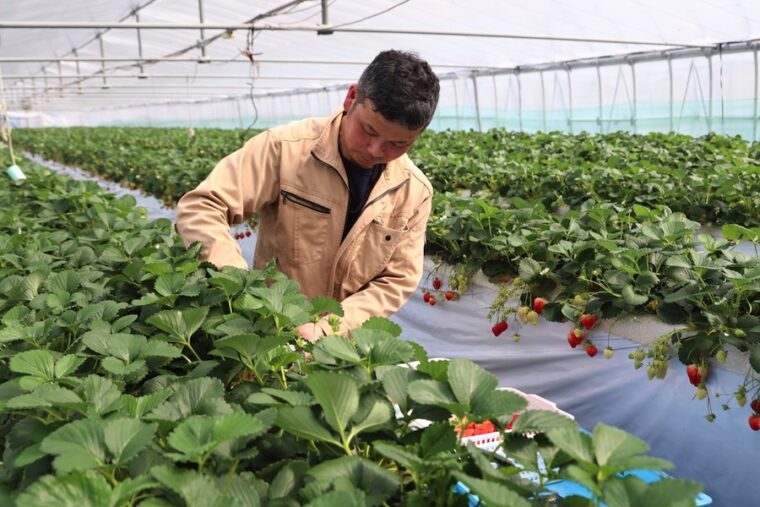 「越後姫」の栽培は7月の苗作りからスタートします 。近年の猛暑でハウス内は40度近くになるため、換気などの対策をしながら夏を乗り越え、10月にハウスへ定植。ミツバチに受粉を手伝ってもらいながら、芽かきや葉かきなど丁寧な手入れを欠かしません。実の成長ペースは太陽と温度次第で、冬場は70〜80日、暖かくなると40日前後で収穫を迎えるそうです。