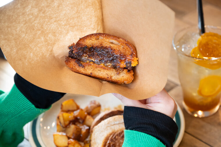 真っ二つにカットした断面を、あふれ出した肉汁でカリッと二度焼きする独自スタイルが特徴です。