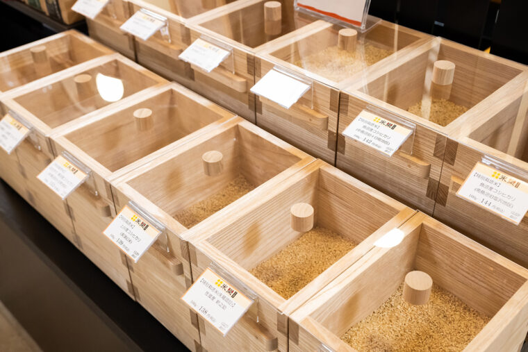 米選定のプロである五ツ星お米マイスターが厳選した、産地や銘柄の異なる12種類の玄米を取り揃えており、玄米から1割を精米する1分づきから完全精米まで、好みの仕立てで店舗精米ができます。