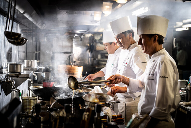 厨房に立つのは三宝グループで料理長経験のある3人。
