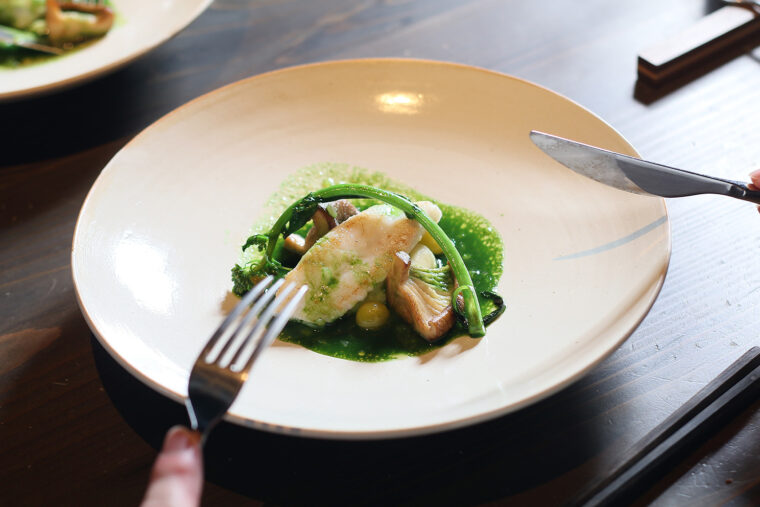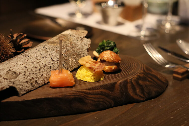 山菜やキノコ、ジビエといった里山の恵みを主役としたフレンチの技法で紡ぐ季節のコースを、県内から選び抜いた希少な日本酒やワインとともに味わえます。