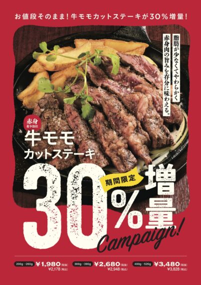 期間中はお値段そのままで『国産牛モモカットステーキ』が30%増量!