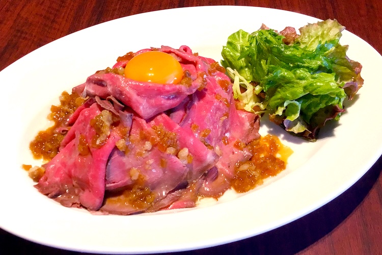 薄切りで柔らかい赤身肉が幾重にも重なり、中央に添えられた卵黄を崩しながらいただくのが醍醐味です。
