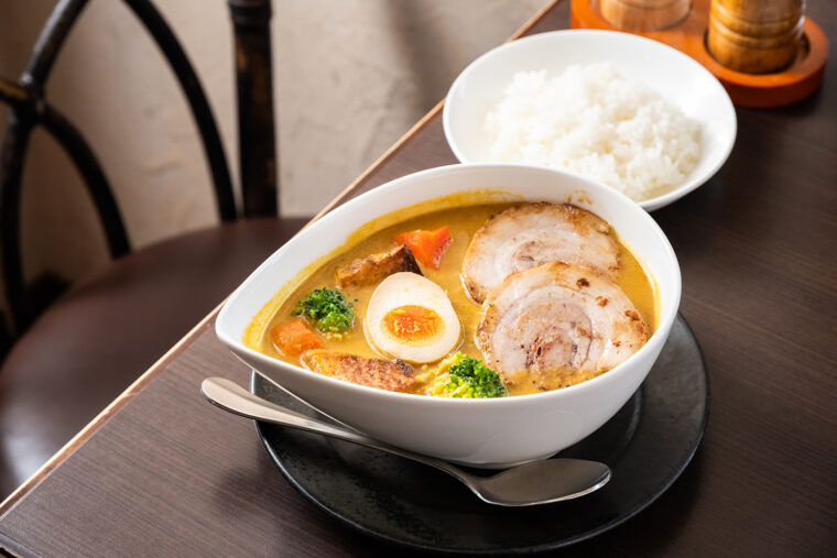 スープのベースはトンコツと鶏ガラ。そこにリンゴや玉ネギ、セロリなどのすりおろした果物や野菜をたっぷりと加え、18種類のスパイスをブレンドした自家製カレー粉を合わせることで、まろやかでクリーミーな味わいに仕上げています。
