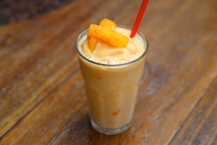 県産柿のジャムとコーンフレークを入れ、生クリーム、バニラアイス、スライス冷凍された柿などをトッピングしたパフェ。