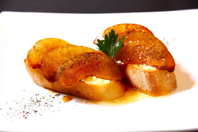 バゲットにクリームチーズと日本なしのキャラメリゼをのせた、やさしい甘みが印象的なひと皿。