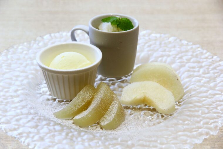 コンポート、アイスクリーム、そして日本なしそのものと、3つの異なる味と食感を楽しめる。