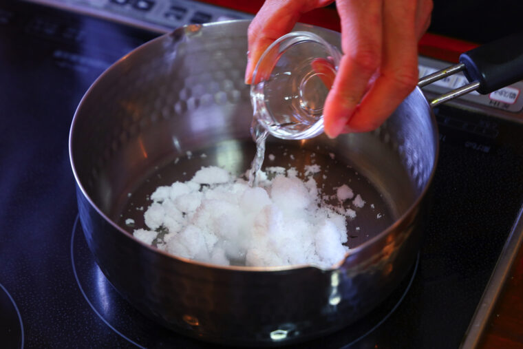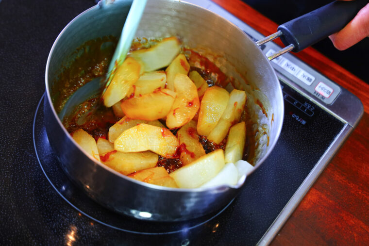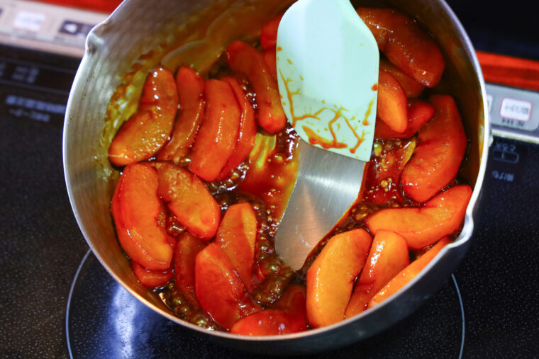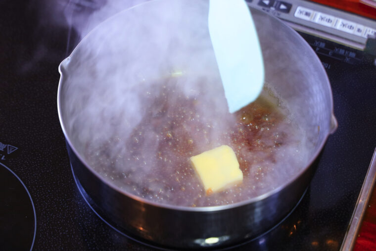 ②フライパンに砂糖(50g)と水を入れて火にかけ、茶色くなったら火を止めてバター(10g)を加える。さらに①とレモン汁を加えたら再び火をつけ、混ぜながらとろみがつく程度まで水分を飛ばす。