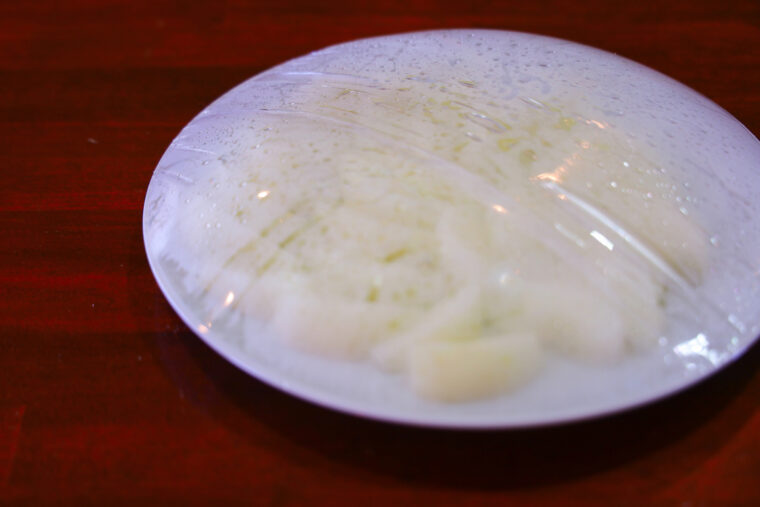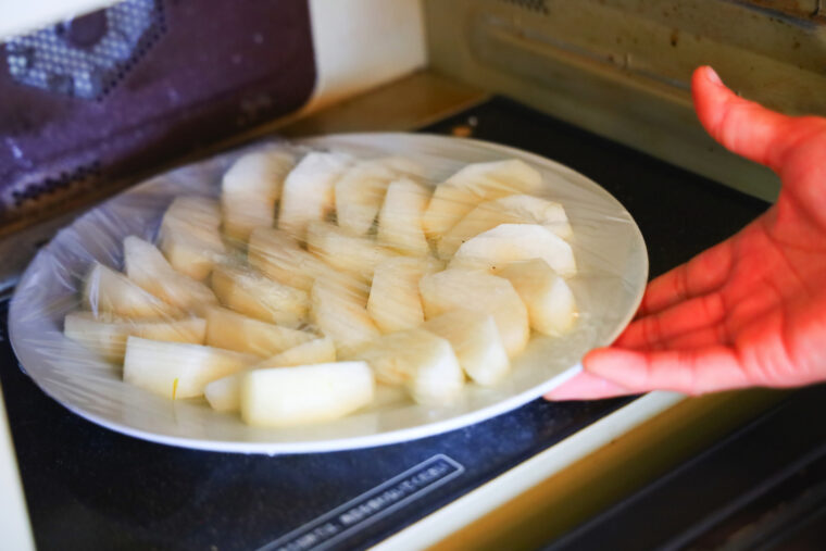 ①なしの皮を剥いて厚み1~2cmのくし形に切り、耐熱容器に並べて電子レンジでしっかりと火を通し(目安は600Wで4分)、ラップをしたまま粗熱を取る。