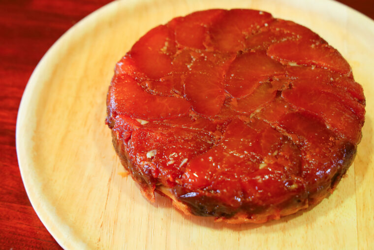 「簡単時短タルトタタン」という語呂のよさもユニークなメニュー。通常はリンゴで作るタルトタタンに日本なしを使いました。タルトタタン作りには、リンゴ(今回は日本なし)を鍋で長時間煮詰めるなど、時間も手間もかなりかかりますが、このレシピでは電子レンジを使うことで、調理時間を本来の半分以下に短縮しています。