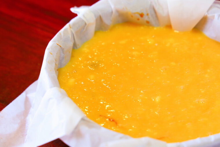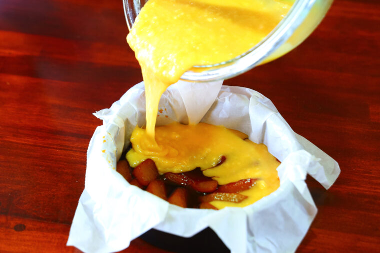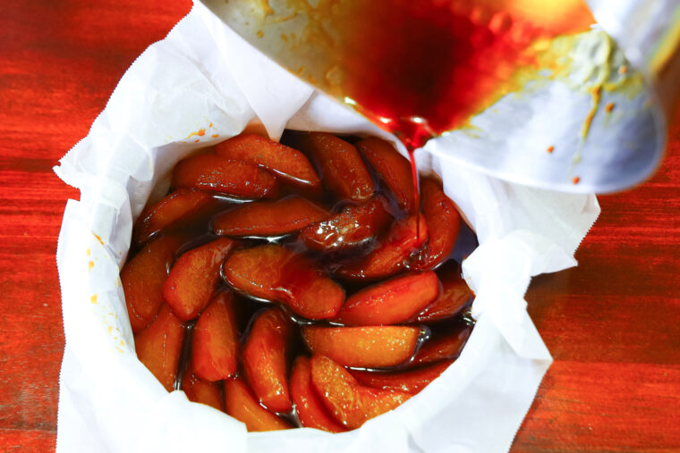 ④ケーキ型の内側にオーブン用シートを敷き、②を敷き詰める。フライパンに残っているカラメルも流し入れ、さらに上から③を流し入れる。