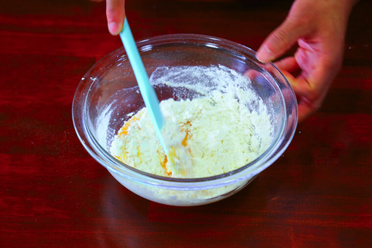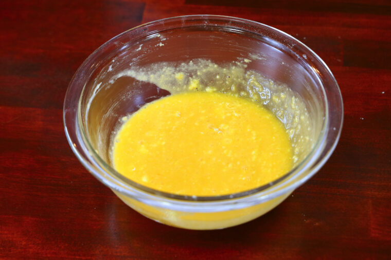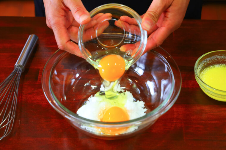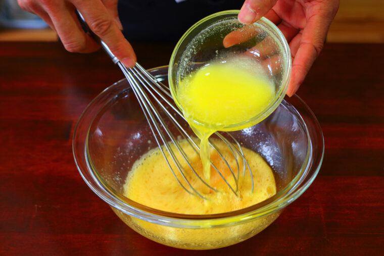 ③ボウルに砂糖と卵を入れて泡立て器でしっかりと混ぜる。砂糖が溶けたら、あらかじめ電子レンジで溶かしておいたバター(60g)を加え混ぜる。さらに合わせて振るっておいた薄力粉と重曹を加えてさっくりと混ぜる。