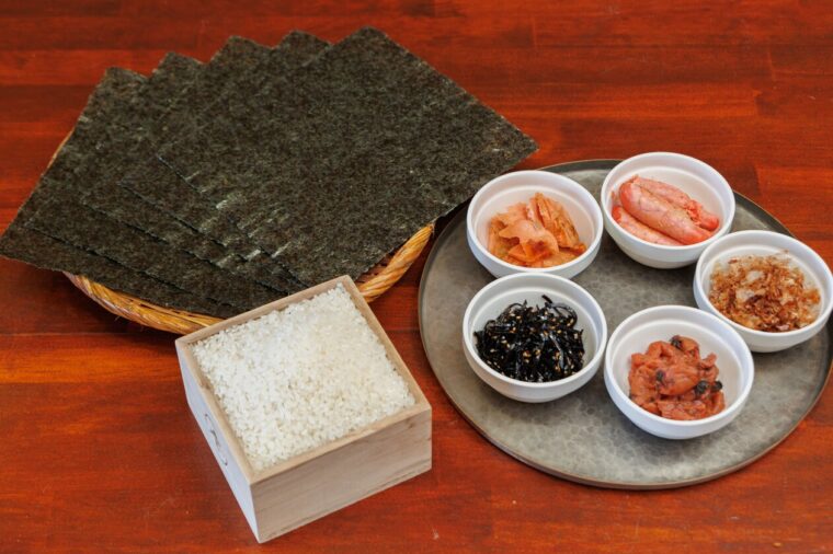 ※今回は焼き鮭のほか、梅干し、昆布の佃煮、たらのこ、おかかを用意しました。