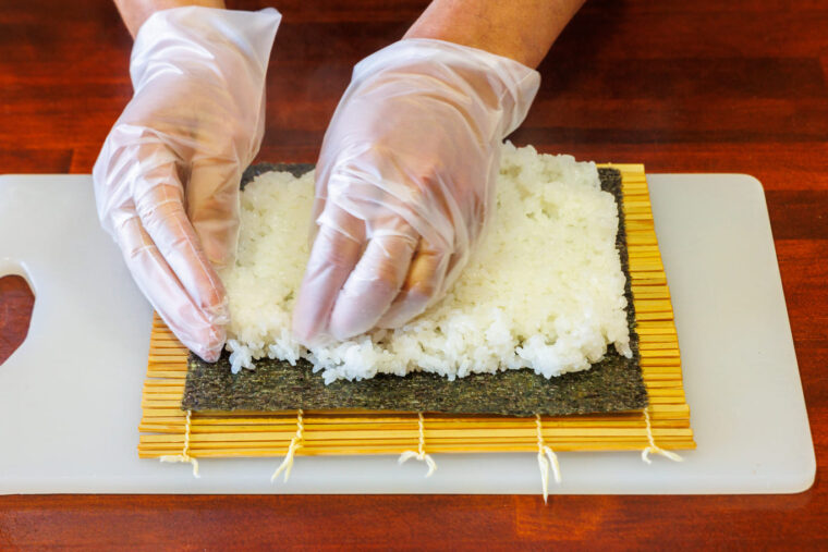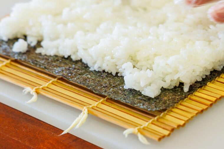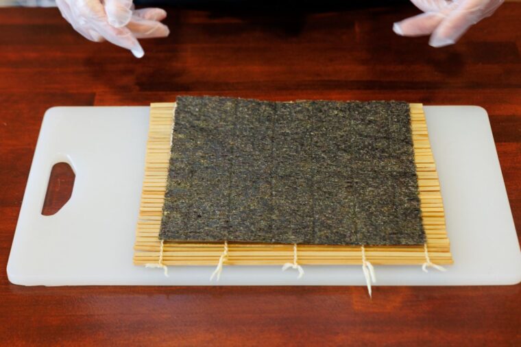 ②.まな板の上に巻きすを広げ、その上に海苔を敷く。