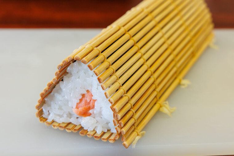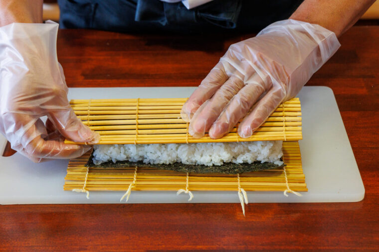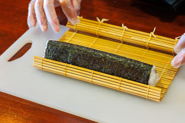 ④.③の手前側に好みの具を横に並べ、巻きす全体を使って手前から巻く。巻き終わったら巻きすを三角形にし、そのまましばらく固定する。