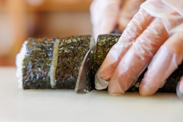 使用する材料は通常のおにぎりと同じ。巻きすで巻き終わった後、包丁で6等分に切ることで、三角おにぎりのようになります。