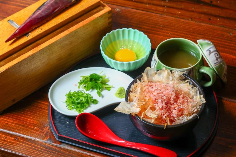 新米コシヒカリの上に、削りたてのカツオ節、マグロ節、鶏節の3種をふんだんに盛り付けた一杯。