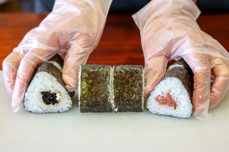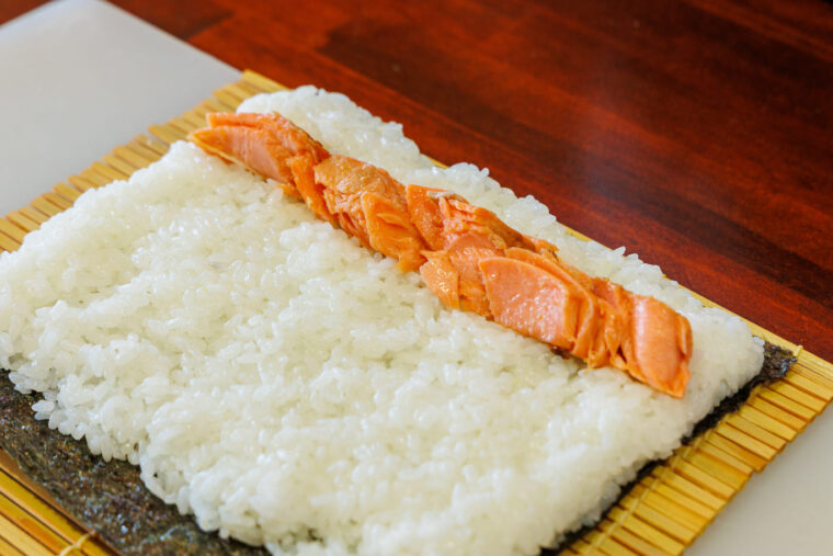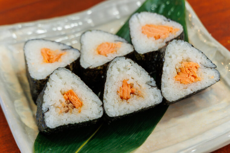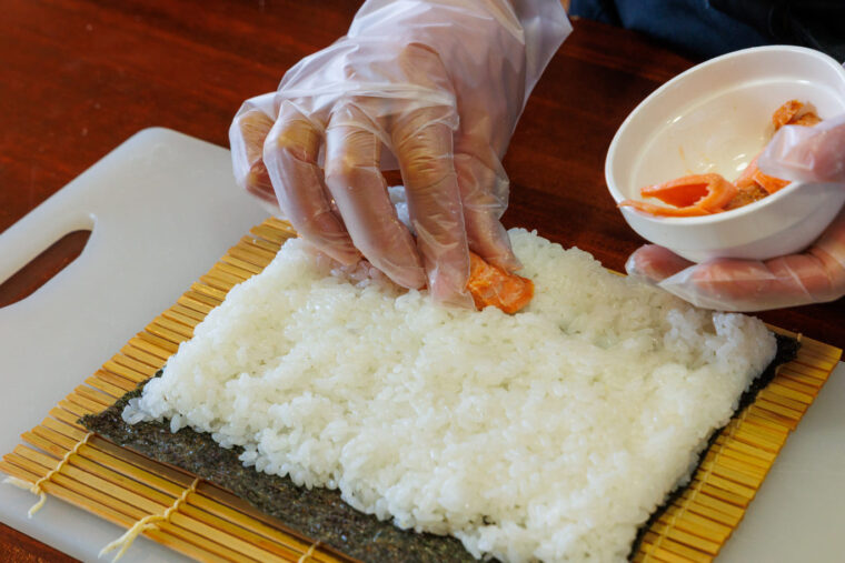 なお、ご飯にのせる具の配置を変えれば、1本の太巻きで2種類以上のおにぎりを作ることも可能です。