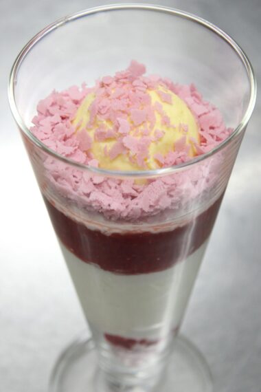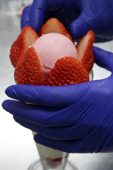 まず、ラズベリーチュイールとてっぺんのイチゴを食べると、イチゴアイスが出てきます。
