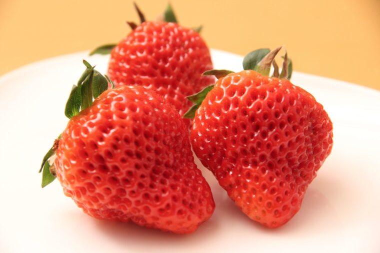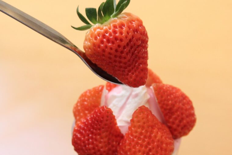 中条たまご直売店では、スプーンからこぼれ落ちそうなほど大きい越後姫をふんだんに使っています。