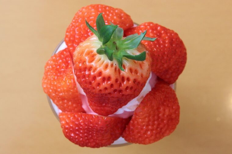 大粒で果肉がやわらかい越後姫。口に含んだ瞬間、甘さのなかにほのかな酸味ただよう果汁がジュワッ~と感じられ出します。これから新潟県内に出まわる越後姫を、いち早くおいしいパフェで楽しめるなんて幸せですね。