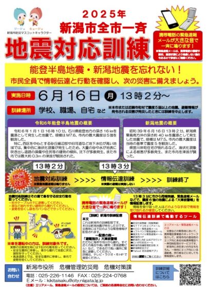 新潟地震の発生日時に合わせて、新潟市全域で地震対応訓練が行なわれます。