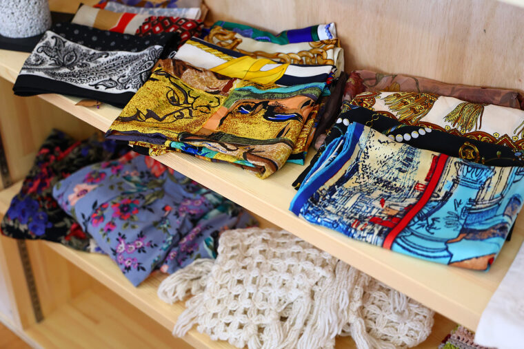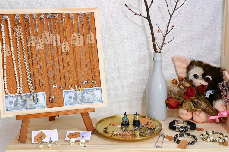 古着のほか、アクセサリーや小林さん手作りの付け襟、靴といったコーディネートにプラスできる小物も販売しています。