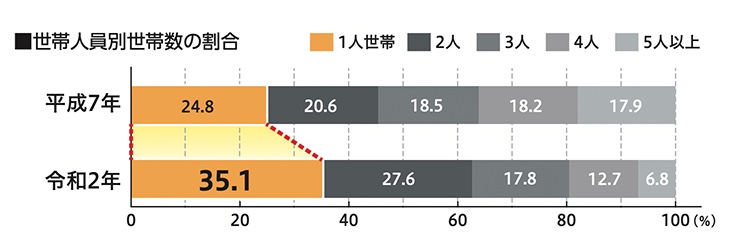 25年間でひとり暮らしの割合が約10%も上昇しました。