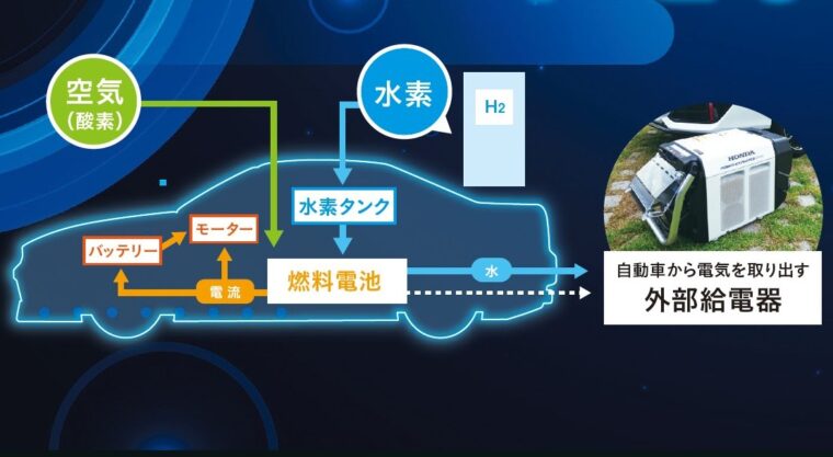 FCVは、空気中の酸素と車に充填した水素を化学反応させて電気を作る「燃料電池」を搭載し、その電気でモーターを回転させて走行します。