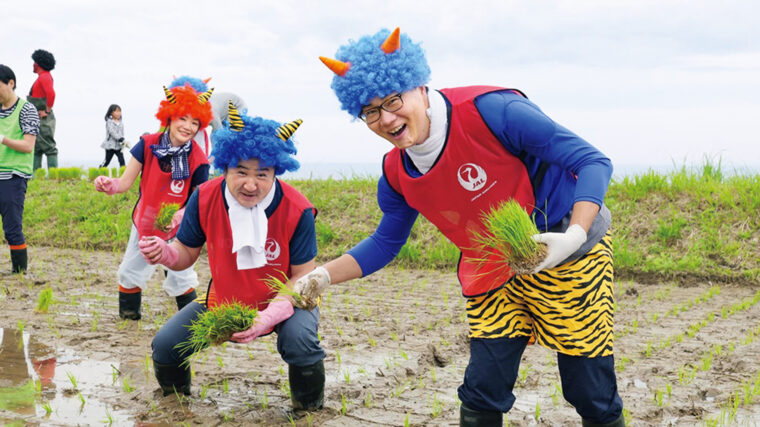 棚田みらい応援団を受け入れてからは、企業も含め更に多くの方々に関心を持っていただいています。地域に残る「鬼の田植え伝説」にちなみ鬼の姿で作業するなど、楽しい経験にできるよう工夫しています。