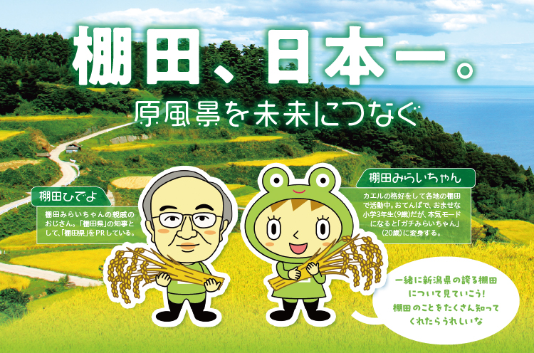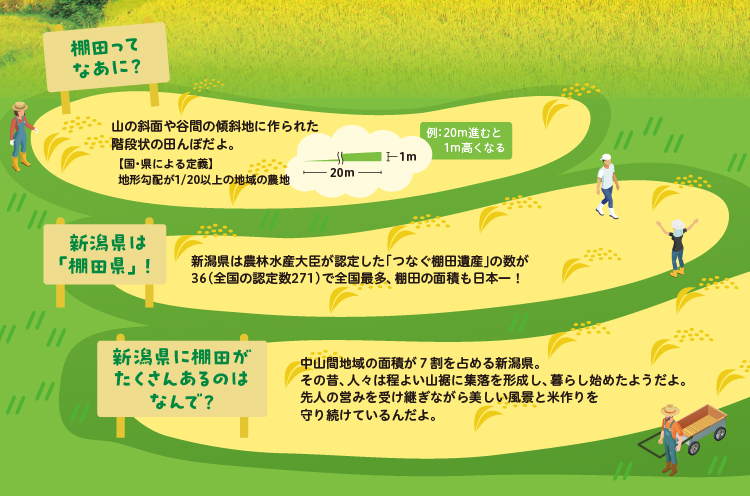 新潟県は、棚田の面積と農林水産大臣が認定した「つなぐ棚田遺産」の数が全国一で、「棚田日本一」を誇ります。棚田は美しい景観だけでなく、歴史や文化にも根ざした新潟県の魅力です。