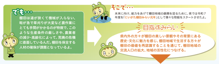 しかし、担い手不足が深刻化しており、棚田の保全は農業や食を守るためにも重要です。そこで新潟県では令和7年度を「にいがた棚田みらい元年」として、棚田の魅力発信や交流人口の拡大に取り組んでいます。従来からの企業・団体参加型の「棚田みらい応援団」の保全活動に加え、さらにハードな草刈りなどを行う個人参加型の「ガチ棚」も開始しました。今後も、県内外の方々が棚田の歴史や文化に魅力を感じ、棚田地域の方々もその価値を再認識できるよう取組を進め、地域活性化につなげていくことを目指しています。