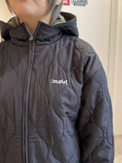 毎年人気のFACE REVERSIBLE JACKETに、加工感たっぷりなスウェットパーカ、カーゴパンツを合わせた、X-girlらしさ満載の冬コーデ。小物も使って華やかに演出してみました。