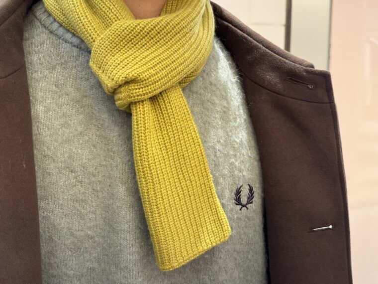 ステンカラーコートはフリースメルトン素材で、軽さと肌触りのよさが魅力です。FRED PERRY別注のクルーネックニットは毛足が長く、柔らかいタッチが特徴的です。
