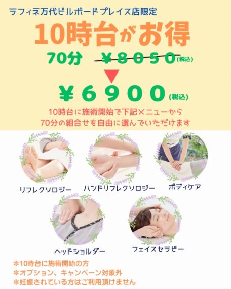 ラフィネBP店では、10:00台の施術スタートで通常料金よりお得になる朝限定コースを用意しています。