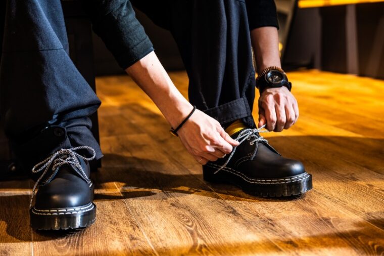 「黒いレザーに映えるイエローステッチがドクターマーチンの代名詞ですが、このシリーズでは白いステッチを2本並べることで、足元のコントラストが劇的に強調されています」と八木さん。
