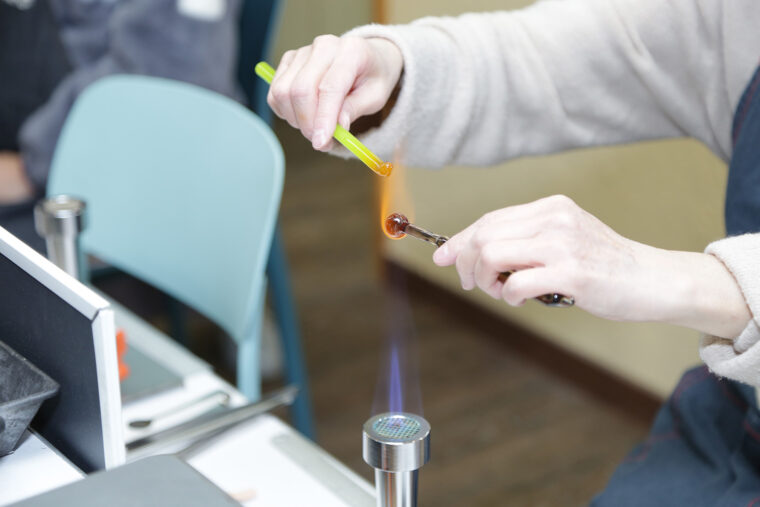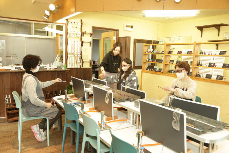 オーナーでありガラス工芸作家の本間さんの指導のもと、楽しく体験するお客さんの姿が。