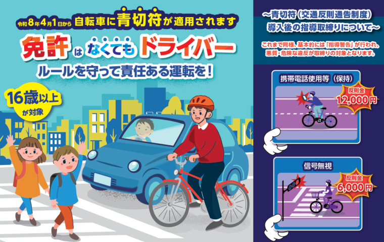 なお、この際に発行される交通反則通告書が、いわゆる「青切符」と呼ばれるものです。自転車も車両のひとつとして、より一層の安全運転が求められています。