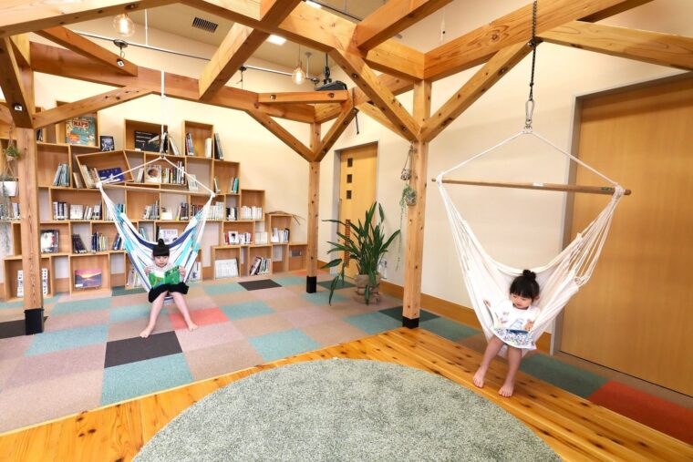 絵本や図鑑などが揃い、ソファやハンモックに座って読書を楽しめるブックコーナーでお風呂上がりものんびり過ごせます。